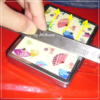 ใช้คัตเตอร์แงะสติกเกอร์ออกจากก้นตลับ ตัดเอาเฉพาะชื่อสี (เพราะถ้าแปะทั้งอันมันไม่พอดีกับตัว pan)