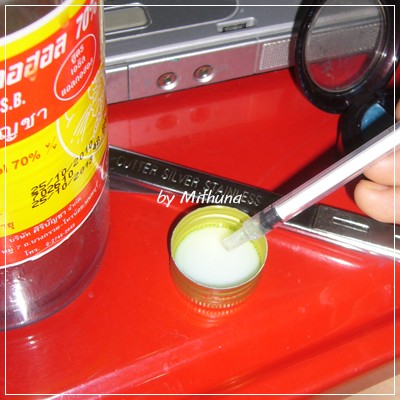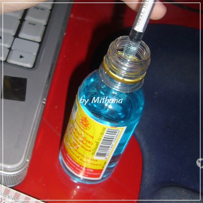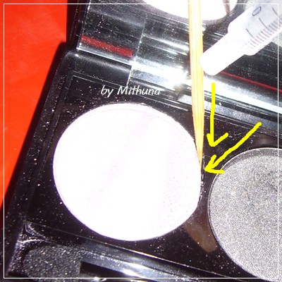 ถ้า กลัวมือไม่แม่น ใส่ไปโดนอายแชโดว์ แนะนำให้เอาไม้จิ้มฟันเสียบไปในช่องว่าง แล้วค่อยๆ กดไซริงให้แอลกอฮอล์ไหลไปตามแนวของไม้จิ้มฟัน