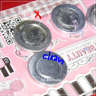 - กาวบางอย่างที่ทาตัว pan จะแน่นมากๆ สามารถใช้น้ำยาล้างเล็บหยดลงไปในช่องว่าระหว่าง pan กับตลับแทนแอลกอฮอล์ได้ (น้ำยาล้างเล็บจะล้างกาวได้ง่ายกว่า) แต่มือต้องแม่นมากๆ เพราะห้ามน้ำยาล้างเล็บเลอะอายแชโดว์ (ใช้วิธีเอาไม้จิ้มฟันเป็นตัวนำของเหลวอย่างในคคห. ที่ 36 ก็ได้ค่ะ)