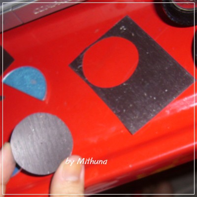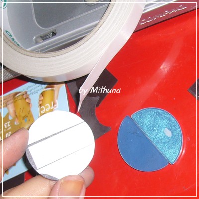 แปะด้วยกาวยาง (เวลาแปะอย่าลืมดูให้ดีนะคะว่าเราหงายแผ่นแม่เหล็กถูกด้าน ต้องหงายด้านที่มันจะดูดกับเหล็กหรือแม่เหล็กนะคะ)
