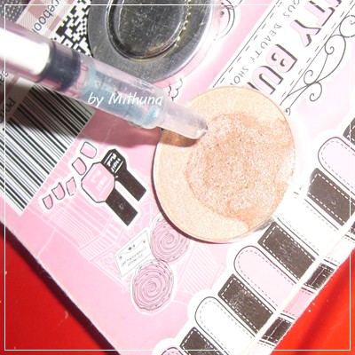 ใส่ ไปในตัวอายแชโดว์ เอาแบบชุ่มๆ หน่อยนะคะ ให้เต็มหน้าถาดอายแชโดว์เลย (อย่าลืมหาอะไรรองที่ตัว pan ก่อนนะ แอลกอฮอล์จะได้ไม่เลอะเปื้อน)
